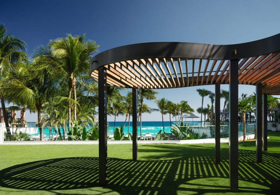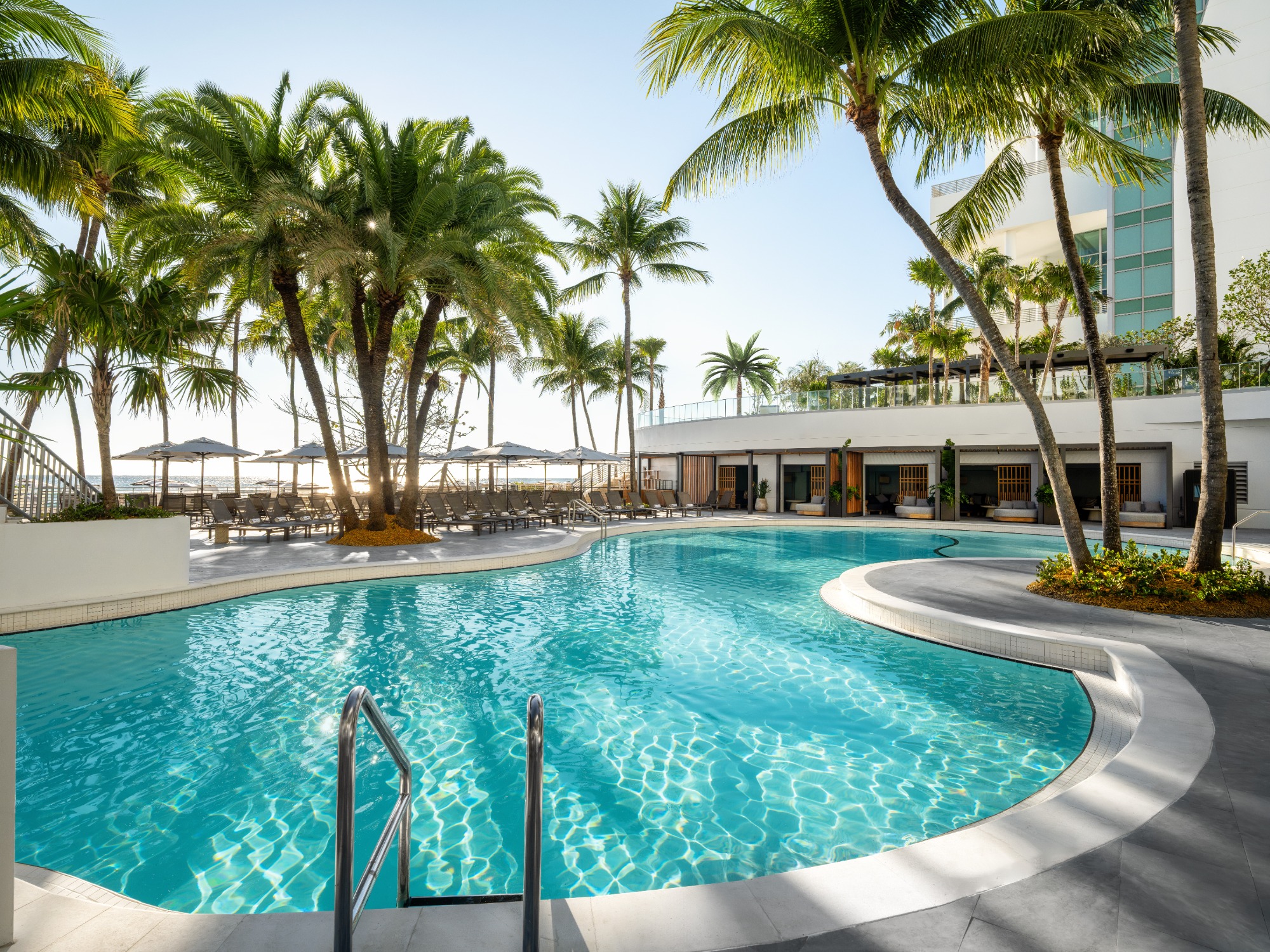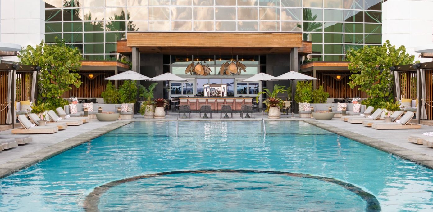 The Diplomat features an outdoor bridged pool with infinity edge, see-through bottom, and waterfall cascading into a 240-foot lagoon-style pool below.